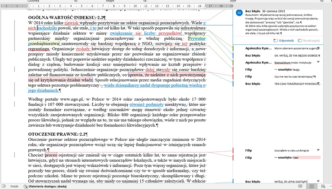 To jest czynność po pierwszej korekcie autorskiej, wykonuje ją osoba, która redagowała tekst. Najlepiej jest, jeśli tekst od autora przyjdzie nie później niż tydzień po redakcji, bo wtedy redaktor jeszcze pamięta tekst, swoje poprawki i uwagi. Zawsze liczymy na to, że autor zastosuje się do naszej prośby o poprawę w trybie śledzenia zmian, bo weryfikacja przebiega wtedy sprawnie, np. artykuł do dwóch arkuszy weryfikujemy ok. godziny.